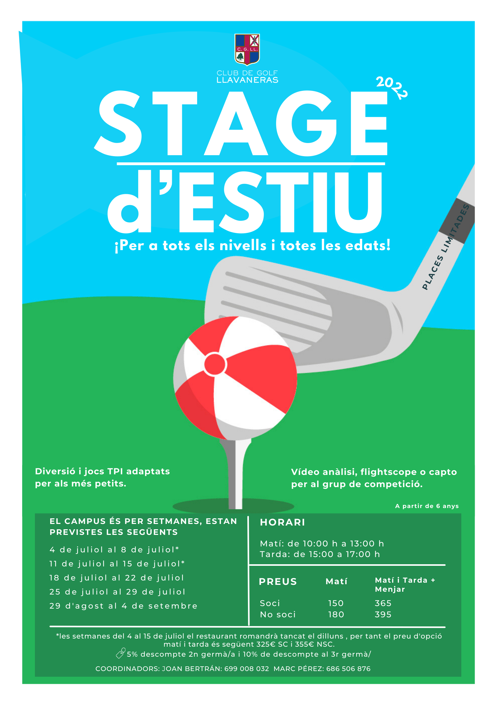 Vols que s'ho passi bé el teu fill/a , que aprengui un nou esport, que faci amics en entorn natural ple de fauna i flora? Apunta al teu fill/a ja! Durant el mes de Juliol l'Escola de Club de Golf Llavaneras realitzarà el Stage d'Estiu 2022.