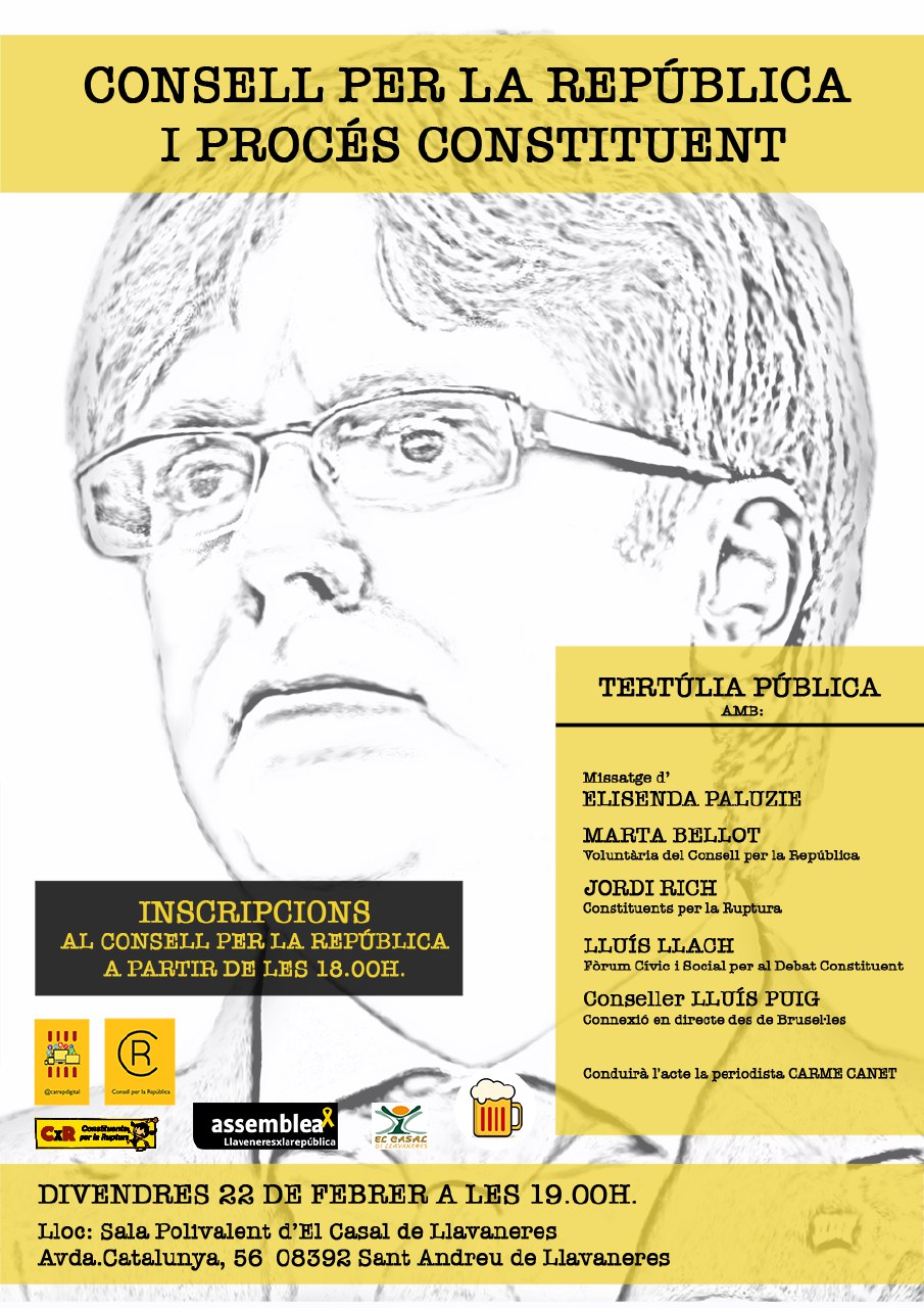 Divendres 22 de febrer a les 19 h a El Casal de Llavaneres Lluis Llach i el Conseller Lluis Puig reflexionen sobre el CONSELL PER LA REPÚBLICA I EL PROCÉS CONSTITUENT.