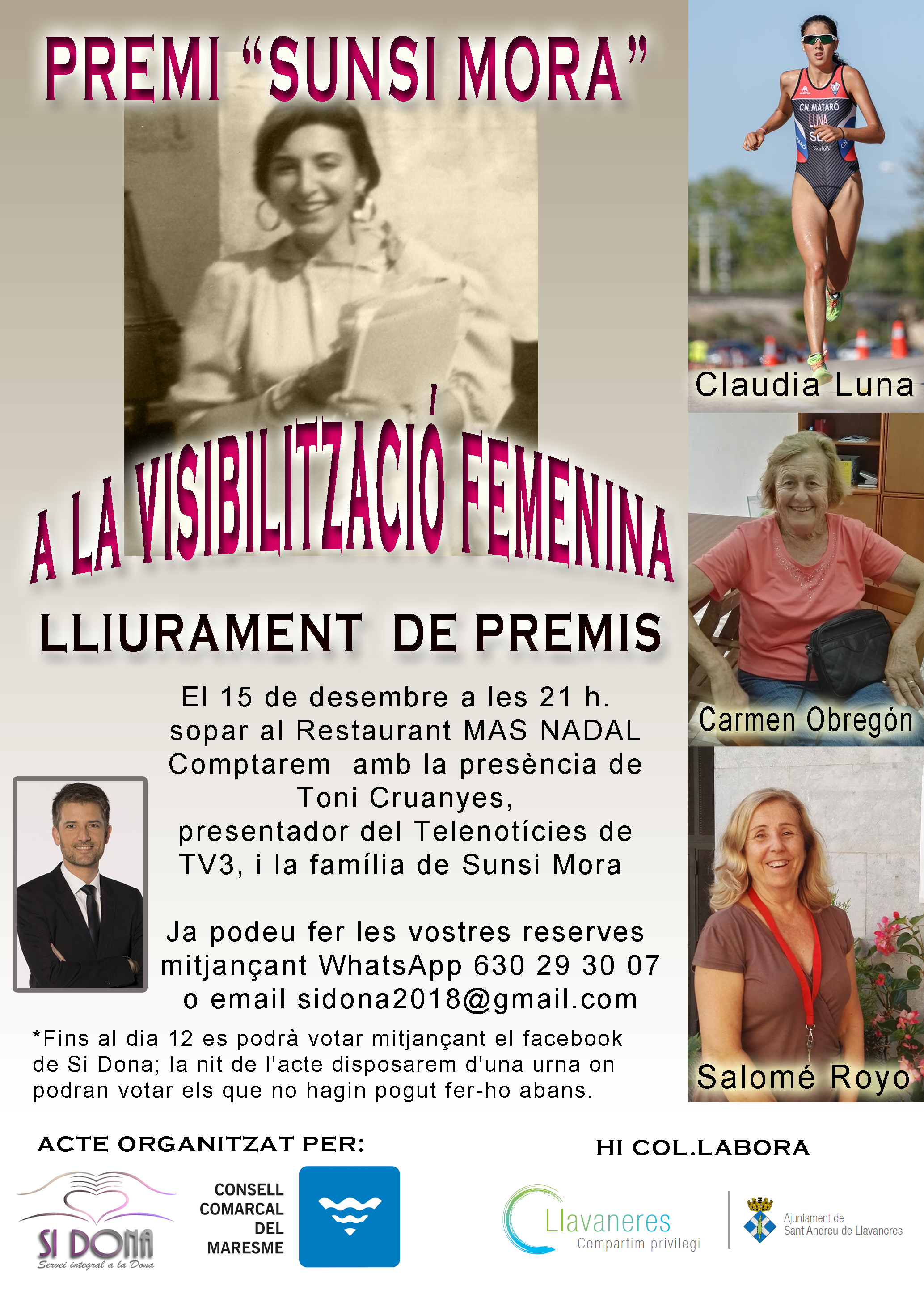 El dia 1 de desembre, Festa Major de Sant Andreu de Llavaneres, es disposarà d'una urna a la Plaça de la Vila per a qui no pugui votar per internet ho pugui fer presencialment, també hi haurà una urna el mateix dia de l'acte del lliurament del premi que es realitzarà al RESTAURANT MAS NADAL el dia 15 de Desembre a les 21h. Gaudirem d'un sopar de gala i música abans, durant i després de l'acte, comptant amb la presència de Toni Cruanyes, presentador del Telenoticies de TV3 i antic alumne de Sunsi Mora.